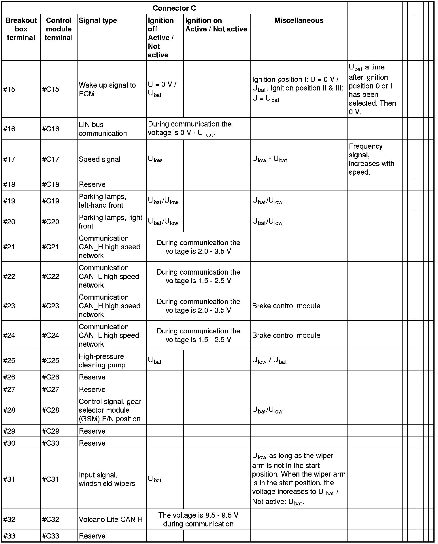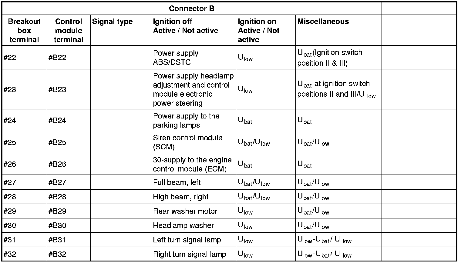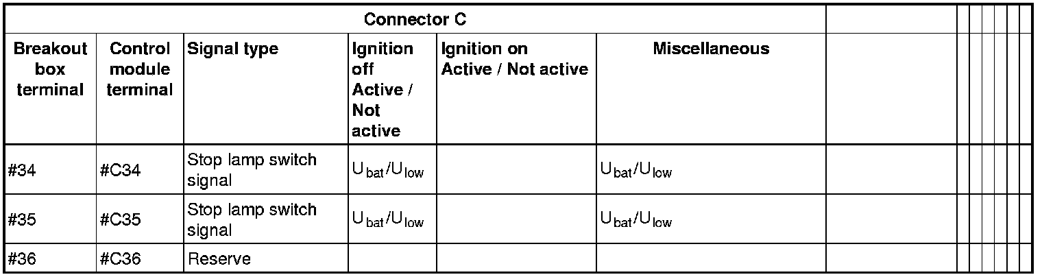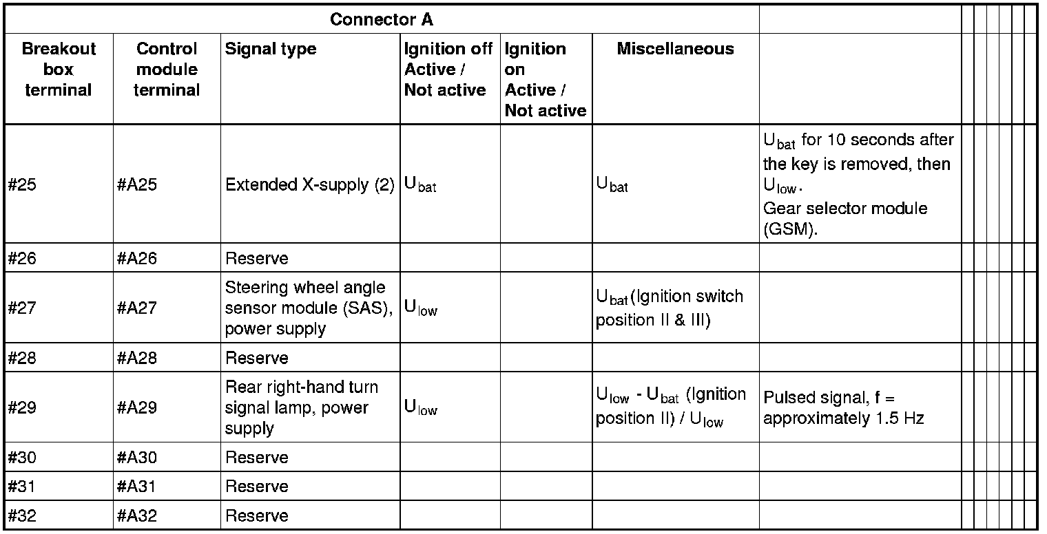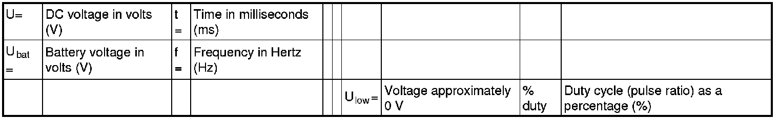 All the values given below are between the terminals stated in column 1 and terminal #D6 in column 2 (power ground). This applies unless otherwise indicated in the last column.