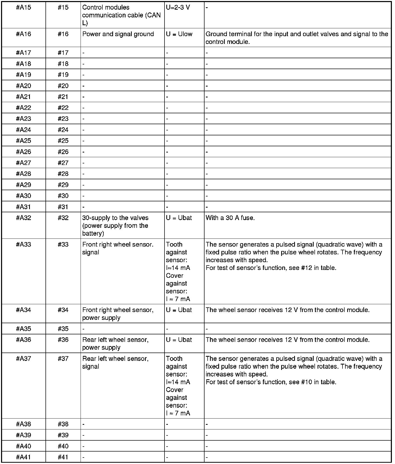 All values given are between the relevant terminal in column 1 and terminal #A16 or #A47 (ground), unless otherwise indicated in brackets.