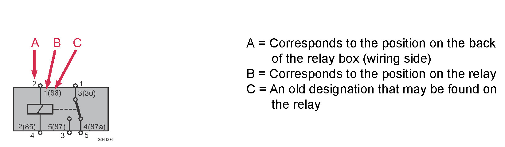 The diagram indicates two or three different designations for the relay's position. This is described below.