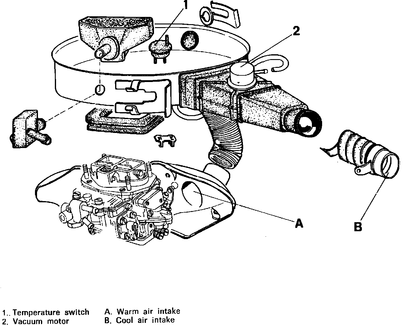 With a cold incoming air charge, a temperature switch activates a vacuum motor which opens the air cleaner flap allowing warm air flowing from the manifold assembly (opening A) to enter the air cleaner.