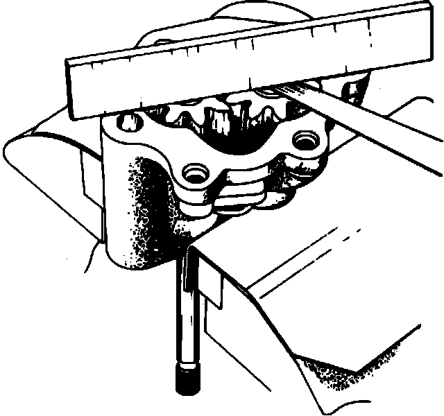 14. Check clearance between gears and the cover mating face. Using straightedge and feeler gauge, Fig. 14. Clearance range should be .008-.0041 inch. If a value of more than .006 inch is found, gears and/or pump housing must be replaced.