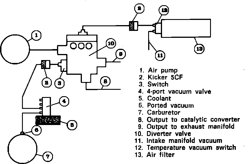 With engine coolant temperature above approximately 128°F, the four port temperature vacuum valve opens. Vacuum from above the throttle plate is applied through the temperature vacuum switch and a kicker to the diverter. Manifold vacuum is also applied through a temperature vacuum switch within the air cleaner at ambient temperature above 60°F. Pump output is channeled to the exhaust manifold at idle, to the catalytic converter at part throttle applications, and vented to the atmosphere at wide open throttle applications.